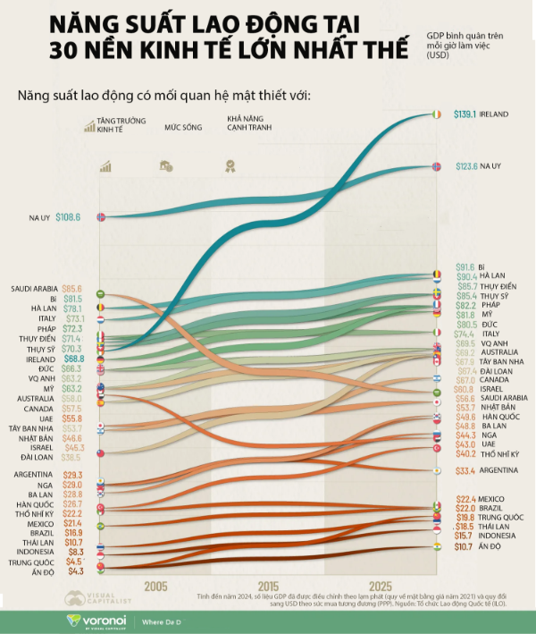 Năng suất lao động của 30 nền kinh tế lớn trong hai thập kỷ, Trung Quốc tăng 340% (04/12/2025)