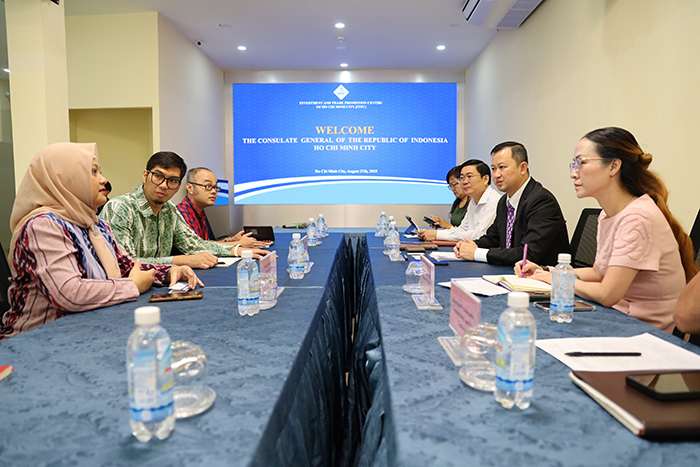 Ngày 27/8, Trung tâm Xúc tiến Thương mại và Đầu tư TP.HCM (ITPC) đã có buổi tiếp và trao đổi với đoàn Tổng Lãnh sự quán Indonesia tại TP.HCM. Cuộc gặp gỡ nhằm giới thiệu cán bộ lãnh sự kinh tế mới sẽ tiếp nhận nhiệm vụ tại Thành phố Hồ Chí Minh gồm bà Septania Rubi Prameswari - Lãnh sự phụ trách Kinh tế I và ông Yudha Virmanto - Lãnh sự phụ trách Kinh tế II, thể hiện quyết tâm chung của hai bên trong việc thúc đẩy quan hệ hợp tác kinh tế - thương mại song phương.