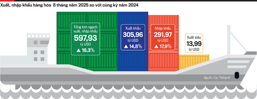 Mặc dù phải đối mặt với nhiều thách thức từ biến động kinh tế toàn cầu và căng thẳng địa chính trị, hoạt động xuất nhập khẩu của Việt Nam vẫn duy trì đà tăng trưởng tích cực trong tháng 8/2025.