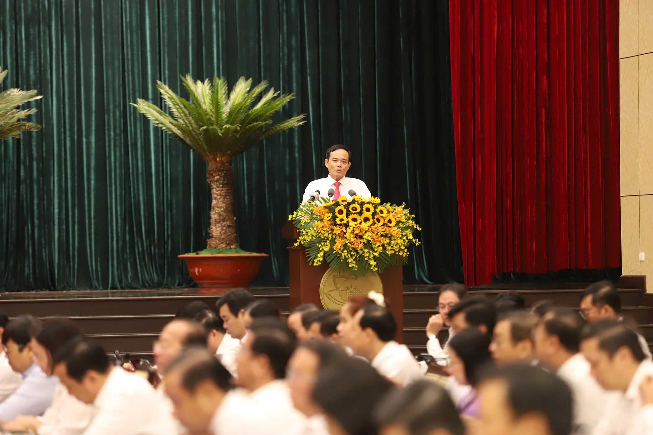 Bí thư Thành ủy TP.HCM Trần Lưu Quang đề nghị các đại biểu tích cực trao đổi ý kiến tâm huyết, ý tưởng hay, cách làm tốt để đạt được mục tiêu tăng trưởng trên 10%.